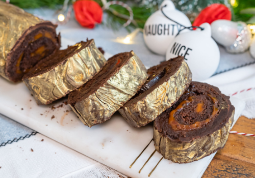 So first up, we've got our Salted Caramel large chocolate brownie rolled around salted caramel. It's gooey, it's fudgy, it's decadent, and to top it all off, it's covered in a really thick layer of chocolate. It was sold as a Christmas special for several years and you couldn’t enough of it as an alternative to the traditional yule log. The thick dark chocolate coating may have tasted great but it meant this was a tricky beast to get into, with the best option being a hot knife to cut slices.