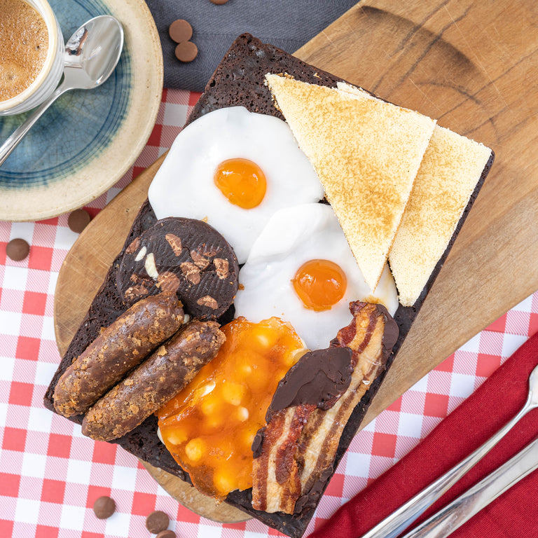 Number 1 has to be one of our wackiest products ever! This is our ‘Full English’ brownie which we sold for a limited time for Father’s Day and National English Breakfast day. It has got everything you might want from an English breakfast, but all in sweet form. There are two fried eggs (fondant with a lovely passion fruit yolk), chocolate and hazelnut rolled into a lovely sausages, chocolate salami black pudding, orange jelly and white chocolate chip ‘baked beans’ and some thin slices of vanilla sponge masquerading as white bread!