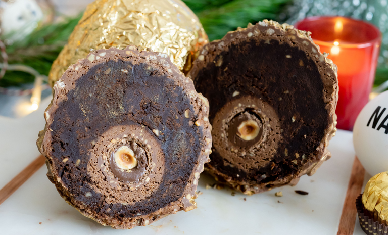 Here, we've got our Ambassador's Golden Ball which was made with a single Ferrero Rocher in the centre, surrounded by a crunchy delight made from milk chocolate, Nutella, hazelnut buttercream with crispy wafer bits. This was then coated in our chocolate brownie - hazelnut flavour, of course, and then finished with more crunchy chocolate then spray gold – it was pretty much 1 kilo of absolute nutty chocolate heaven.