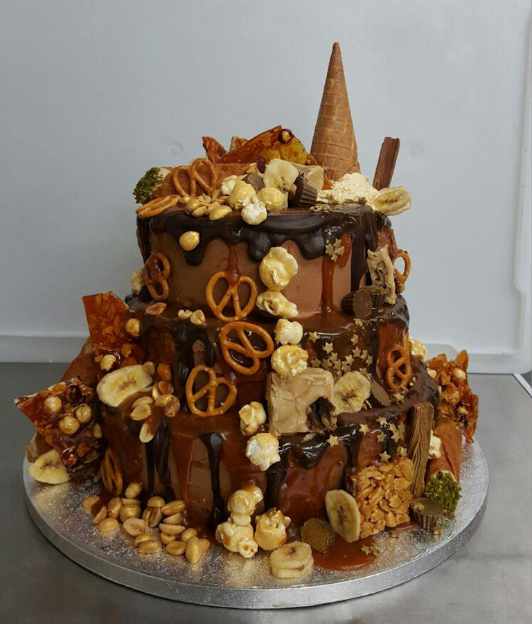 Third place is our chocolate brownie freak cake, sold only in very limited numbers. This is absolutely loaded with three tiers of the most unbelievable deliciousness. Chocolate Brownie, Chocolate Ganache, Salted Caramel, Caramel popcorn, Reese's pieces, pretzels, peanut butter, caramel brittle chocolate flakes and more - it's got everything. Served with a firework fountain!